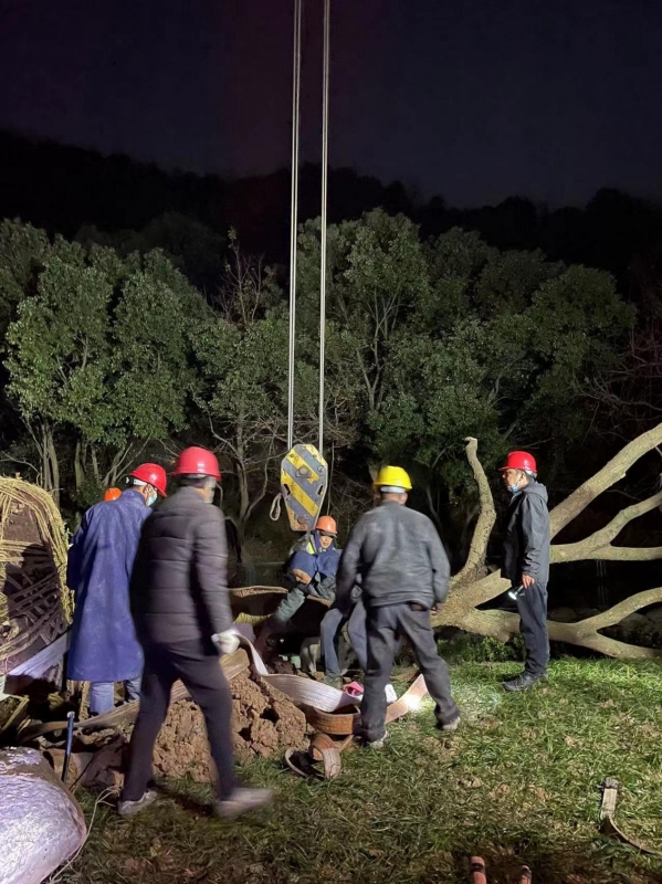 已近冬至日的夜晚,戶外溫度格外的寒冷,為趕在下一道工序進場前將樹木移植到位,在時間緊,任務重的情況下,園林公司增加機械設備、人員等所需生產(chǎn)要素的投入,形成了多個作業(yè)面同時施工。全體項目成員眾志成城、攻堅克難。臺州市城市園林工程有限公司工程科科長翁穎帶領(lǐng)整個項目團隊并肩作戰(zhàn),協(xié)調(diào)組織項目班子和團隊人員進入“白加黑”作業(yè)的搶工模式。本次搶工從當晚的18點至凌晨3點,共移植香樟、桂花,銀杏等大樹16棵。