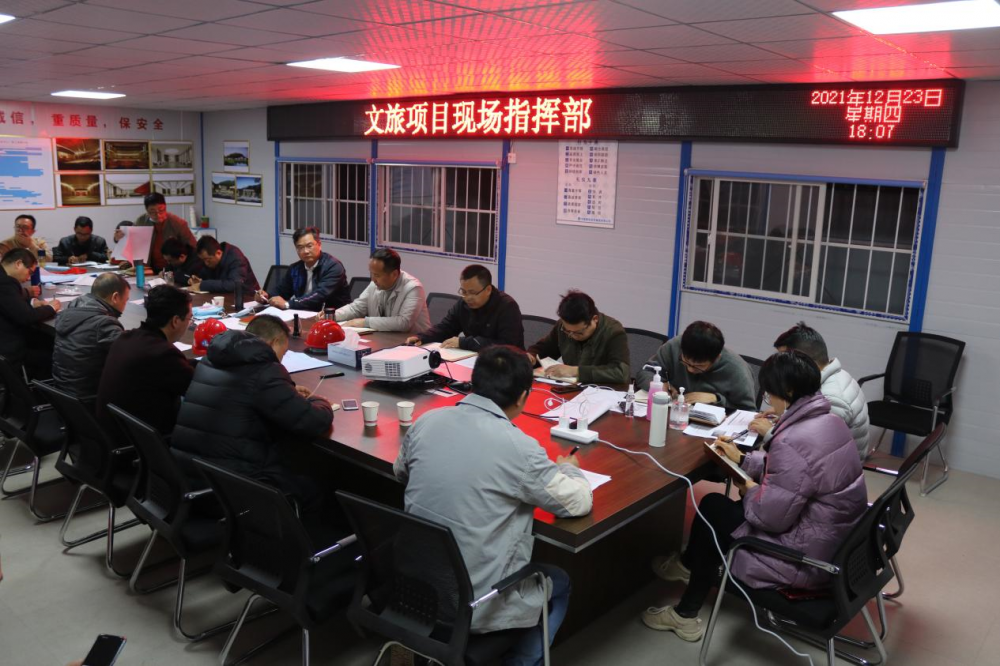 12月23日晚,文旅項(xiàng)目現(xiàn)場指揮部召開碰頭會,新區(qū)黨工委委員、集團(tuán)黨委書記、董事長郭健跳帶領(lǐng)班子領(lǐng)導(dǎo)現(xiàn)場辦公,處理施工組遇到的難題。